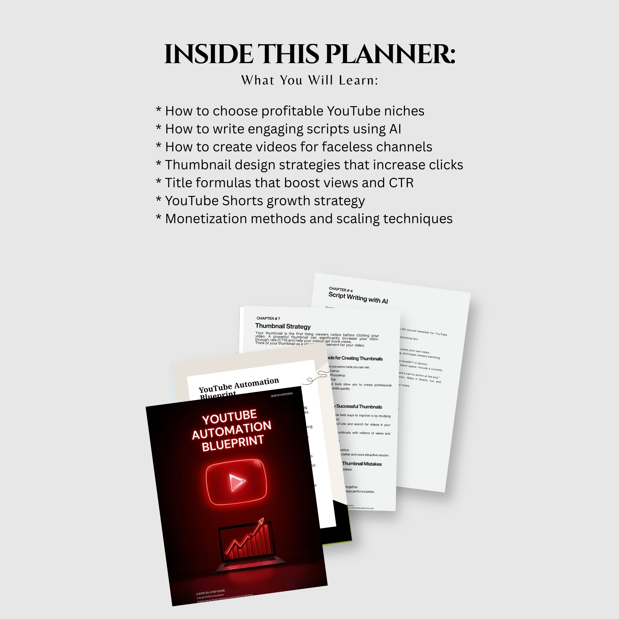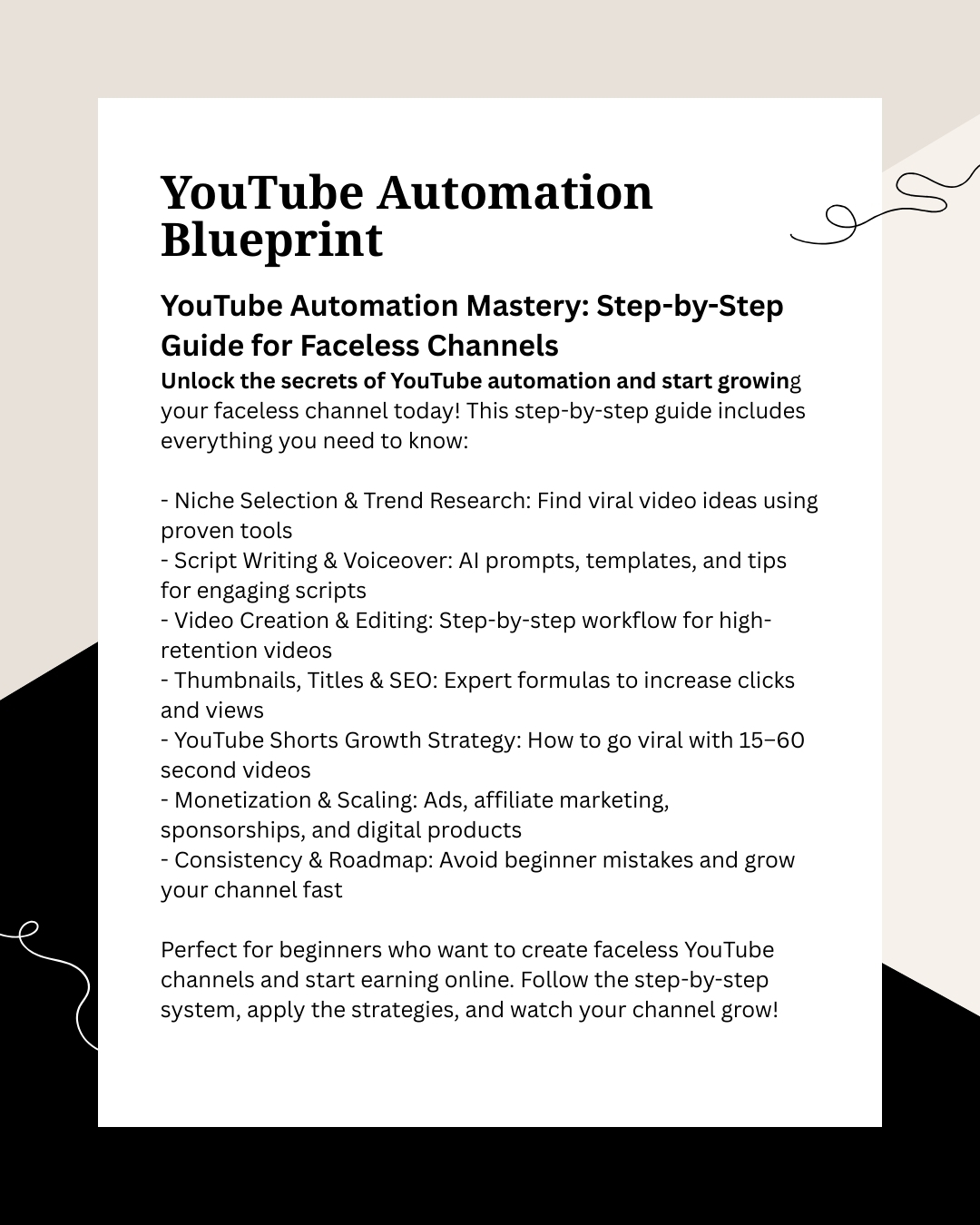 This YouTube Automation Guide is a step-by-step ebook designed for beginners who want to grow a YouTube channel without showing their face.